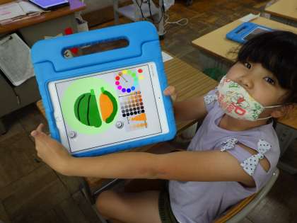3年生は国語の時間に、ローマ字に取り組んでいます。iPadのプログラミングアプリを使って、きらいな食べ物を好きな食べ物に変身させるゲームを作りました。