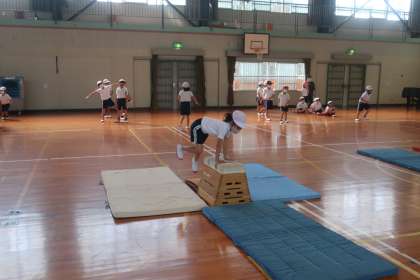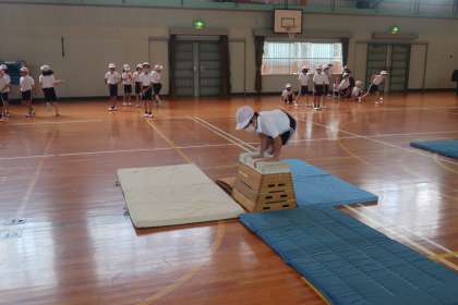 体育の授業で、跳び箱の学習を行いました。久しぶりに身体を動かす子も多かったため、怪我がないように、少しでも跳び箱に慣れるために、横跳びの練習から始めました。久しぶりに取り組みましたが、どの子も上手に跳ぶことができました。
