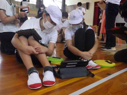 9月13日月曜日に6年3組で体育の研究授業がありました。夏休み前から取り組んできたテニピンの試合をタブレットで撮影し、さらに上達するためにどうすれば良いのかチームで相談しながら考えることができました。