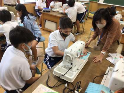 家庭科の学習でミシンを使い始めました。上糸、下糸の通し方やミシンの扱い方など、子どもたちは一生懸命に身に付けようとしています。二人一組でミシンを使っていますが、互いに教え合ったり、聞き合ったりしながら進めている姿が、すばらしいなと思います。今後は、エプロン作りをしていきます。