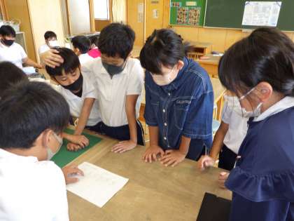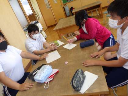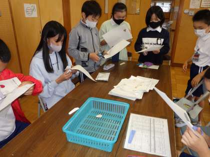 学級委員を中心とするリーダー会では、しおり作りを頑張っています。イラストや表紙のデザインを募集して、学年全員の力で作成しています。