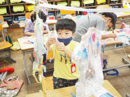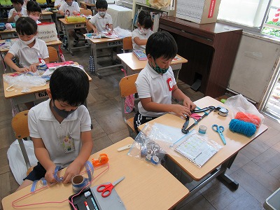 図画工作科の学習では、ハンガーにタフロープやリボンなどをつけて、風にひらひらゆれる素敵なかざりを作りました。教室にみんなの作品を吊り下げて、「風に揺れてきれいだよ」「クラゲみたいに動いているよ」などと、お互いの作品を鑑賞しながら楽しむこともできました。材料の準備など、ご協力いただきありがとうございました。