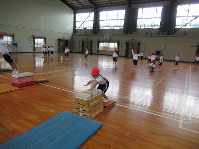 体育館での学習は、跳び箱に挑戦しています。いろいろな跳び方をしたり、ぴたっと着地できるように意識して取り組んだりしています。体力向上補助員の先生にアドバイスをもらって、跳び箱のどこに手をつくとよいかを考えました。また、どのように踏み切るとうまく跳べるかを工夫する姿も見られました。