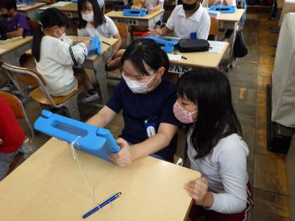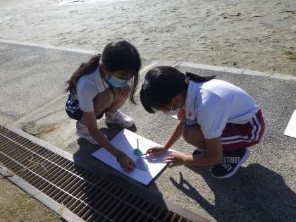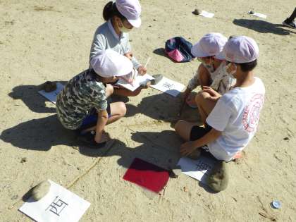 理科の学習「地面のようすと太陽」では、まず影の位置の変化を調べました。影が動くのは太陽が動くからだと予想した子どもたちは、次に太陽の位置の変化を調べました。方位磁針の使い方を覚えて、地面に東西南北の線を引き、太陽が見える方角を時間ごとに記録していきました。