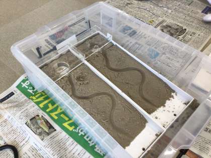 理科「流れる水のはたらき」の単元で、小さな川を作って流す水の量を変えることでどのような変化が起こるのか、実験しました。砂が流されたり、川が決壊したりするなどの様子を観察し、流れる水には様々な働きがあることに気づいていました。