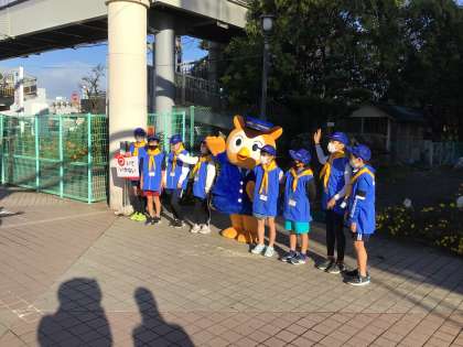 警察と協力して行っている防犯少年団の活動で登校時立哨活動を行いました。「コノハ警部」と一緒に登校する児童や保護者の方に向けてあいさつ運動を行いながら防犯について呼びかけをすることができました。笑顔があふれるすてきな活動になったと思います。