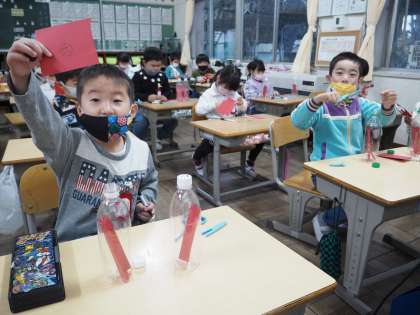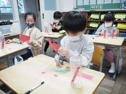 運動会に向けて、ペットボトルを使った応援グッズを作っています。今年度は、声を出しての応援が難しいため、ペットボトルに飾りを付けて、音を鳴らしたり、振ったりして応援します。画用紙に「力をあわせてがんばるぞ」などとメッセージを書き込んだり、好きな形に切ってペットボトルの中に入れたりして、楽しく作っています。