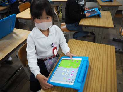 タブレットを使ってプログラミング学習を実施しています。「ビスケット」のアプリを使って、自分の描いた絵がどのように動くかを考えながら、プログラムを組んでいます。いろいろな操作を試しながら活動しています。