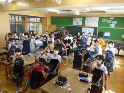 家庭科の学習では、やっとエプロンが完成しました。お気に入りのエプロンを着て、味噌汁づくりを一人一鍋で行う調理実習を計画しています。