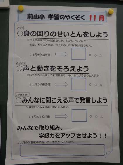 11月になりました。今月の「前山小 学習のやくそく」を掲示しました。子どもたちは、この目標に向けて努力していきます。今日も頑張っている子どもたちの姿がありました。