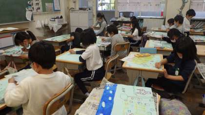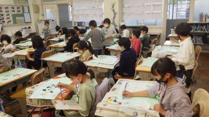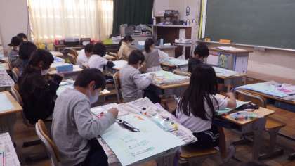 本日、図画工作科で読書感想画に取り組みました。「ぼくは カメレオン」という本からどんな場面のどんなカメレオンを描くのかを決め、色や模様を考え、一生懸命描いています。