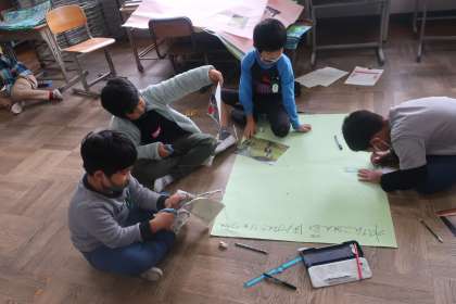 生活科では、以前実施した学区探検のまとめ学習を行っています。模造紙に自分たちが訪れた場所について、説明を書いたり、写真を貼り付けたりしてまとめています。レイアウトを考えながら、班の子と相談しながら進めています。