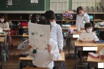 国語科では、「お手紙」という題材の読み取り学習をしています。音読をして登場人物のかえるくん、がまくんの気持ちを想像しています。
