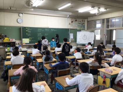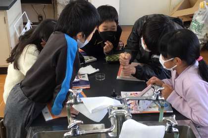 1組は、理科の「ものの温度と体積」の単元で、空気の温度の変化と体積の変化の関係を実験で調べました。試験管に石鹸水のまくをつくって自分たちの手であっためている様子です。しばらくすると平らだった石鹸水のまくが少し膨れ上がってきて、目をキラキラさせて観察していました。これからの実験が楽しみですね。