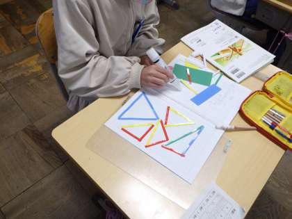 国語「モチモチの木」では、主人公豆太の性格や気持ちがわかるところをペアで伝えあいました。理科「電気のとおり道」では、豆電球に灯りがつくつなぎ方や、どんなものが電気を通すのかについて実験をして調べました。算数「三角形」では、4色の長さの違う色棒を並べていろいろな三角形を作りました。個人、ペア、グループで楽しみながら学びを深めています。