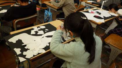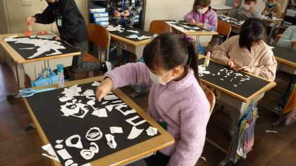 今週は、はさみを使って白い画用紙を自由に切り、偶然できた形を基に発想を膨らませ、並べ方を工夫して、黒い画用紙に貼っていきました。「恐竜が見えてきた」「海の中かな」など自由に表現を楽しみました。