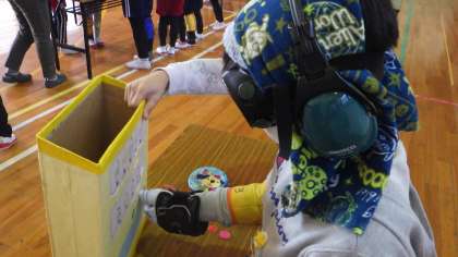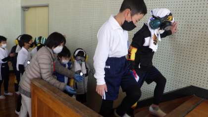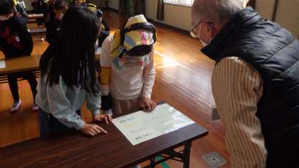 3年生は総合的な学習の一環として、高齢者疑似体験を行いました。講師の方をお招きして、高齢者についてのお話をお聞きしました。その後、ゴーグルやサポーターなどの装具を装着して階段を下りる、指を動かす、物を見るといった体験を通して、今の自分たちとはどう違うのかを感じ、高齢者の方のためにできることを考えました。