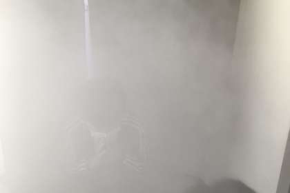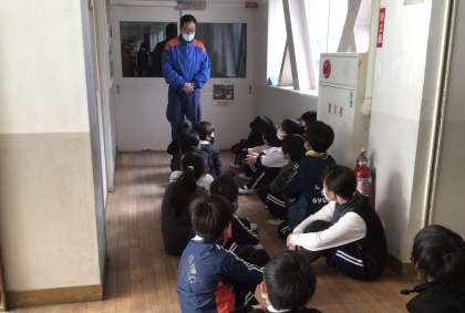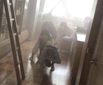 その中で、3・4時間目に煙道体験がありました。消防署の方から、「煙はまず上にのぼるので、早いうちにかがみながら避難するのがよい」「煙が充満したら周りは見えない」「壁づたいに歩くのが一番安全」などのお話を聞きました。真っ暗な中に煙の充満している理科室を歩きました。甘い匂いのする煙でしたが、それでも煙を吸う気持ち悪さや前の見えない怖さを十分体験できたようでした。また、知っている理科室だから迷わずに歩けましたが、知らない場所ではもっと歩きにくいはずだということや、非難経路や非常口を常に確認するようにした方が良いということにも気づきました。