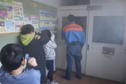昨日、4〜6年生は防災体験を行いました。この写真は、4年生の煙道体験の様子です。第一理科室で行いましたが、いざ理科室に入ると何も見えないほどの煙の量で、廊下にまで煙があふれていました。体験前はとても緊張した様子でしたが、体験後は「何も見えなかったよ」「机にぶつからなくてよかった」と言い、ほっとした様子でした。いざという時のためによい経験になりました。