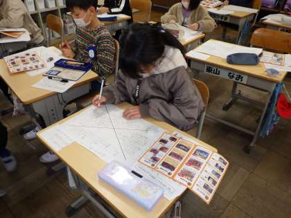 社会科の学習では、先日の消防署見学で得た情報を、自分なりに種類分けして「Xチャート」で分類しました。「これは、消防士さんの生活かな?」「これは、消防車の内容だな」と分けていくことができるようになりました。