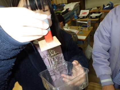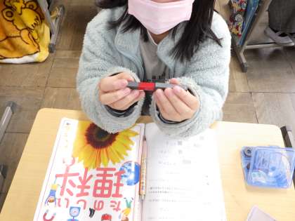 理科の学習は「磁石のひみつ」を調べています。磁石の先に段ボール紙をくっつけた状態で、クリップが何個引き寄せられるか?段ボール紙の枚数を2枚・3枚に増やしたら?段ボール1枚の状態では、最高20個でした。また、磁石にはN極とS極があることを知り、極と極を近づけたらどうなるかについても調べました。そして、磁石を使っての砂鉄探しがブームになりそうな予感です。
