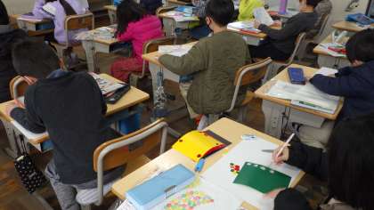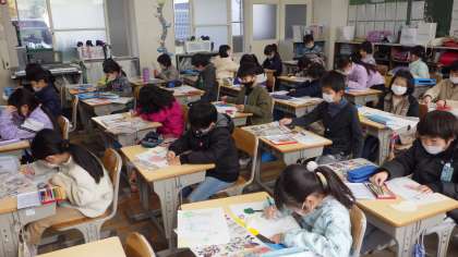 図画工作科「たのしく うつして」で版画に取り組んでいます。生き物の絵をテーマにして、どの色をどの形にしようか悩みながら制作しています。写してできる形に新たな発見があるといいですね。