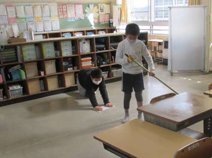 時間になると机を移動させ、ほうきでごみをはき、ぞうきんがけをします。ぞうきんを絞るのも一苦労ですが、ちょっとの我慢で克服しています。みんな頑張っています。