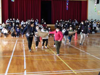 本日、「6年生を送る会」を行いました。1年生は、6年生と一緒に「夢を運べ!次の空へゲーム」の出し物を行いました。6年生2人、1年生2人が4人一組になって、力を合わせて、ボールを落とさずに運んでいくゲームです。1年生は、司会、ゲーム係、応援団、メッセージ係に分かれ、準備から練習や本番まで、6年生に「ありがとう」の気持ちを伝えるために一生懸命取り組みました。当日は、6年生も1年生も笑顔で楽しみ、素敵な時間を過ごすことができました。