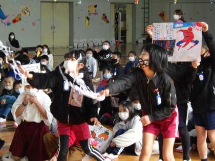 3年生は、プレゼントとして似顔絵や卒業記念メダルを入れる封筒を作りました。当日は「世界の果てまでキイテQ!」と題して、外国のクイズを出題しました。国語科「外国のことをしょうかいしよう」で学習したことを活かし、各クラス1問ずつ考えました。動きをつけたり楽器を弾いたりして、楽しい発表ができました。