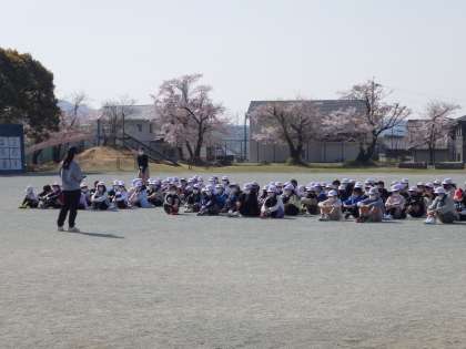 暖かな春の日差しの中、運動場で初めての学年集会を行いました。