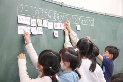 算数科「ひょうとグラフ」では、教科書にあるカードを使って好きな遊びを貼り、どんな工夫をすると数えやすいかを考えました。