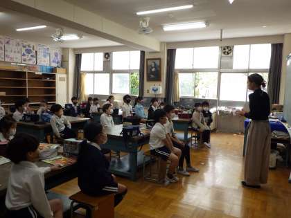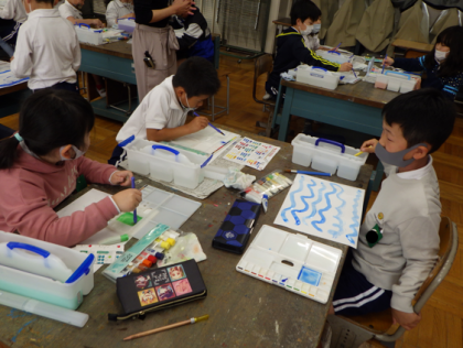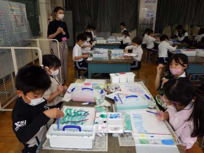 図工「えのぐ+水+ふで=いい感じ」では、2色以上の絵の具を掛け合わせて新しい色をつくったり、水を混ぜたりして、楽しみました。水を混ぜると少し違った色になることに気づき、とてもいきいきとした姿がみられました。次、絵の具を使うときに生かせるといいですね。
