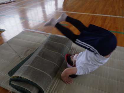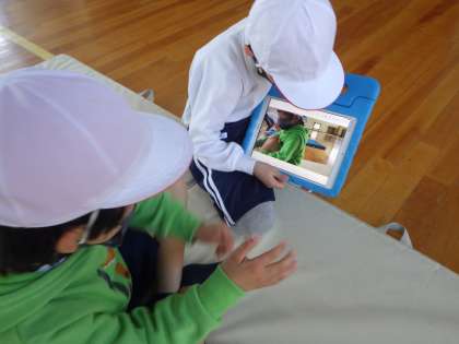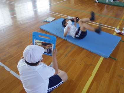 体育科「マットあそび」の学習では、いろいろな転がり方やマット遊びを行っています。動画に撮ってお互いの転がり方を確認し合い、上手にできるように頑張っています。