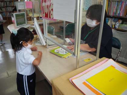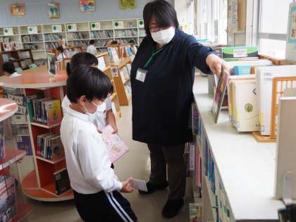 国語「ほんがたくさん」の学習では、学校図書館司書の安藤先生に図書館の使い方を教えていただき、実際に本を借りました。絵本や図鑑、読み物の本など、図書館にはたくさんの本があり、子どもたちは「どの本にしようかな」と迷いながらも楽しそうに本を手にしていました。1人2冊まで、1週間借りることができます。本を大切にして、いろいろなお話に親しんでもらえると嬉しいです。