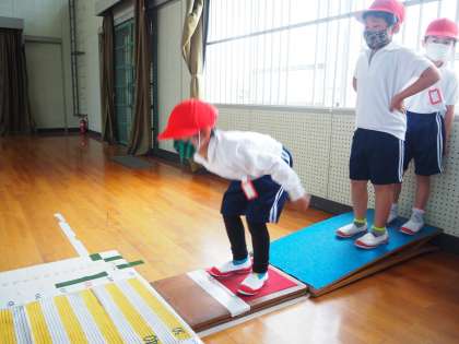 体育「とびあそび」の学習では、体力テストの立ち幅跳びの練習をしました。より遠くに跳べるように、手の振り方や膝の使い方も工夫していました。1年生の体力テストは、立ち幅跳び・ボール投げ・50m走の3種目です。力が発揮できるように、体調を整えて本番を迎えられるといいなと思います。