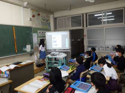 GWの宿題としてタブレットで調べ学習をしました。「〇〇市のひみつ」と題して、愛知県の中から調べたい市町村を選び発表しました。発表内容から味噌カツやひつまぶし、手羽先が出ると「食べたい」という声が聞こえてきて教室に笑顔が広がりました。