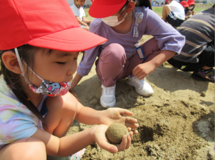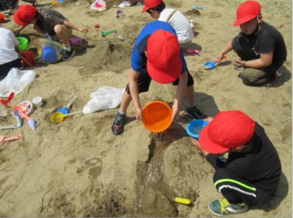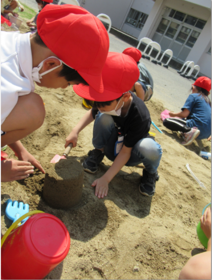 図画工作科「すなやつちとなかよし」の学習を行いました。手で砂や土を触ってみると「さらさらしてる」「ちょっとぬれてるから固まりやすいよ」等多くのことを感じることができました。また、用意していただいたバケツやカップを使うといろいろな形を砂や土で作ることができ、形の面白さを味わっていました。水を加えると遊びの幅も広がり、川を作ったり、土を固めたり、池を作ったりして楽しみました。多くの道具や着替えの準備、ありがとうございました。