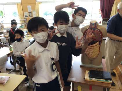 理科では、「体のつくり」についての学習が始まりました。不気味な模型に興味津々です(笑)様々なことに興味をもち、積極的に学習していてとても素敵でした。