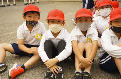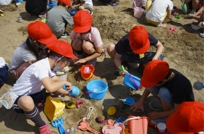 図画工作「すなやつちとなかよし」では、お家から持ってきた道具を使って、砂場を掘ったり、形を作ったりしました。「高い山を作ろう!」「ここに水を入れて川を流そう!」と、友だちと協力して砂遊びをする姿が印象的でした。説明を聞く姿勢も素晴らしいですね!