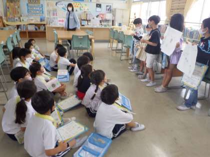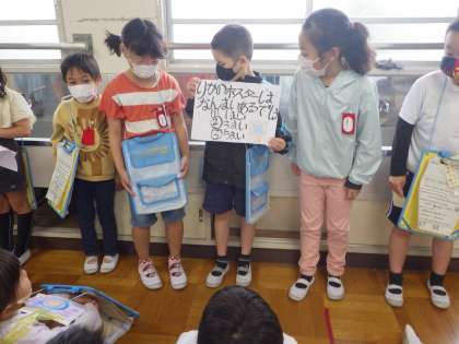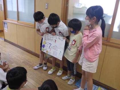 本日、1・2年生による学校探検を行いました。2年生が特別教室や体育館などの前で、その場所にかかわるクイズを考え、1年生に出題しました。1年生のために漢字をひらがなで書いたり、クイズをゆっくり大きな声で読んだりするなど、たくさんの工夫が見られました。