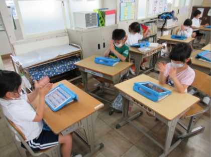 音楽の学習では、「かたつむり」の歌に合わせてリズム打ちをしました。自分が考えたリズムをタブレットで班の子に共有し、一緒にリズム打ちを楽しみました。