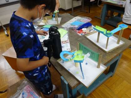 図画工作科「コロコロガーレ」の学習では、子どもたちがぞくぞくと作品を完成させています。どの子も、創意工夫を生かした作品を作ることができました。