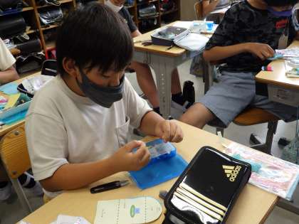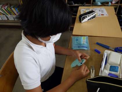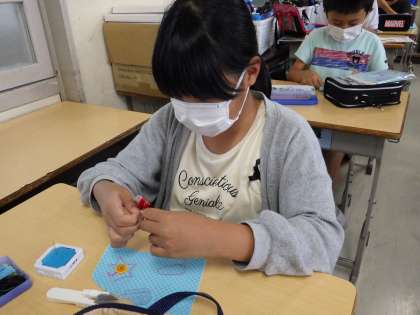 家庭科「ひと針に心をこめて」の学習では小物作りに取り組んでいます。初めのころは苦戦していた、玉結び・玉どめも今ではずいぶん上達してきました。どのクラスでもなみぬい、返しぬい、本返しぬい、かがりぬい、ボタンつけなど各技能を使って小物作りに夢中になっています。みなさんの夢中になる姿がとても嬉しく思います。完成まであと少し。来週も頑張りましょうね。