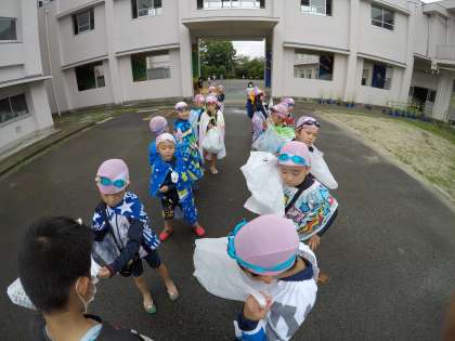 体育ではプールの授業を行っています。「やった!雨が止んだ!」意気揚々とプールに向かうと、突然の豪雨。びしょびしょになりながら一生懸命頑張りました。