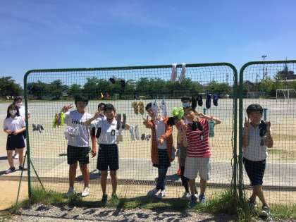 家庭科の学習で、洗濯の授業をしました。子どもたちは楽しそうに自分の靴下を汚し、自分で洗濯をしました。この猛暑の中、靴下が乾く時間の速さに驚いていました。
