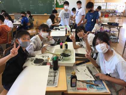 図画工作では、墨を使ったアートに取り組みました。筆の使い方や水の使い方で表現できるものが違い、いろいろな作品を工夫して子どもたちは作っていました。墨で服を汚して帰ってきた子もいるかもしれません。すみません、、、。