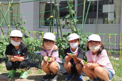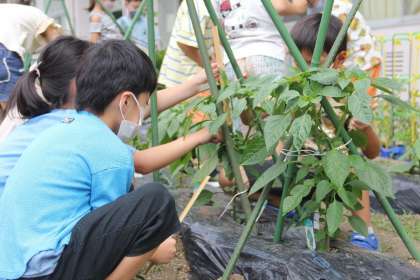 生活科「たくさん できたよ」で育てている畑の野菜や自分の鉢のミニトマトが実ってきました。大きくなった実を収穫すると、「すごく大きい」「早く食べたい」など、とても楽しそうな声や笑顔がありました。