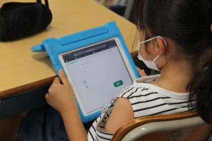 7月1日から学習用タブレット内の学習アプリ「Qubena」(キュビナ)を使って国語科の月例テストの漢字をなぞったり、算数科の授業の復習をしたりしながら、学習しています。