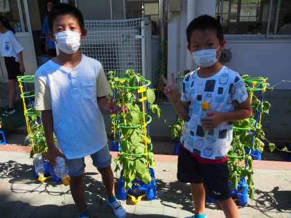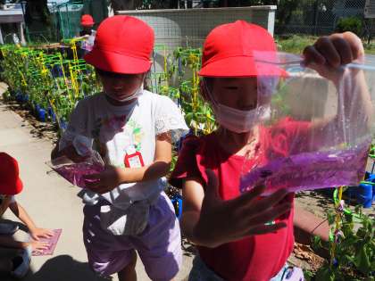 遂に、アサガオの花が咲き始めました。紫色や青色などの綺麗な花が咲き、子どもたちは喜びの声をあげていました。毎朝、アサガオの水やりをしながら、「今日は7個も花が咲いたよ」「ピンク色の花が咲いて綺麗だよ」などとお話をして、アサガオの生長を楽しみにしている姿が見られます。また、アサガオの花で色水遊びをしたり、押し花をしたり、自然と親しみながら楽しく活動しています。