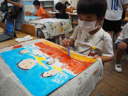 図画工作科「みてみてあのね」の学習では、小学校で初めて絵の具を使いました。筆の使い方や彩色を工夫しながら、素敵な絵を完成させました。個別懇談会時にも作品を展示しますので、是非ご覧ください。